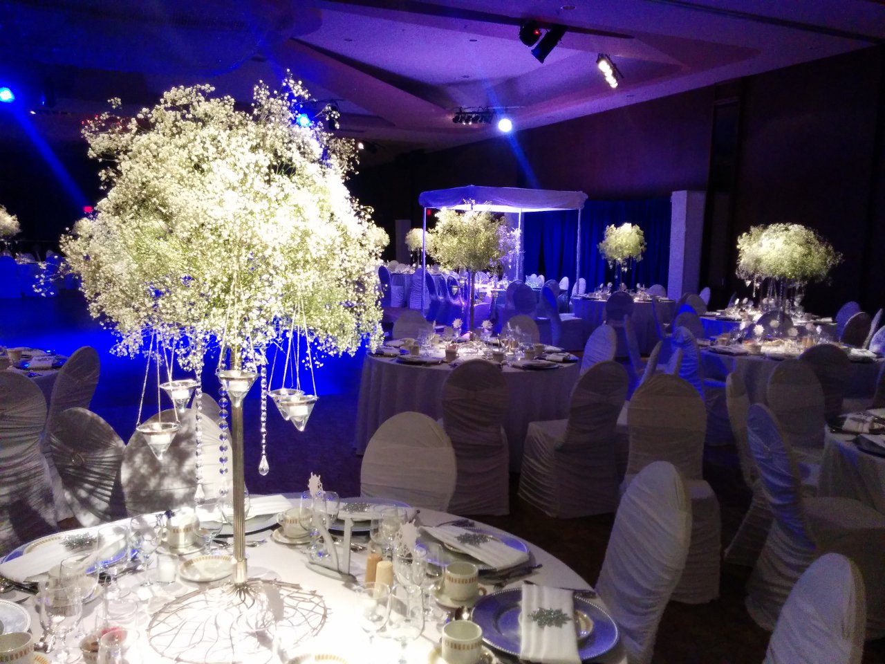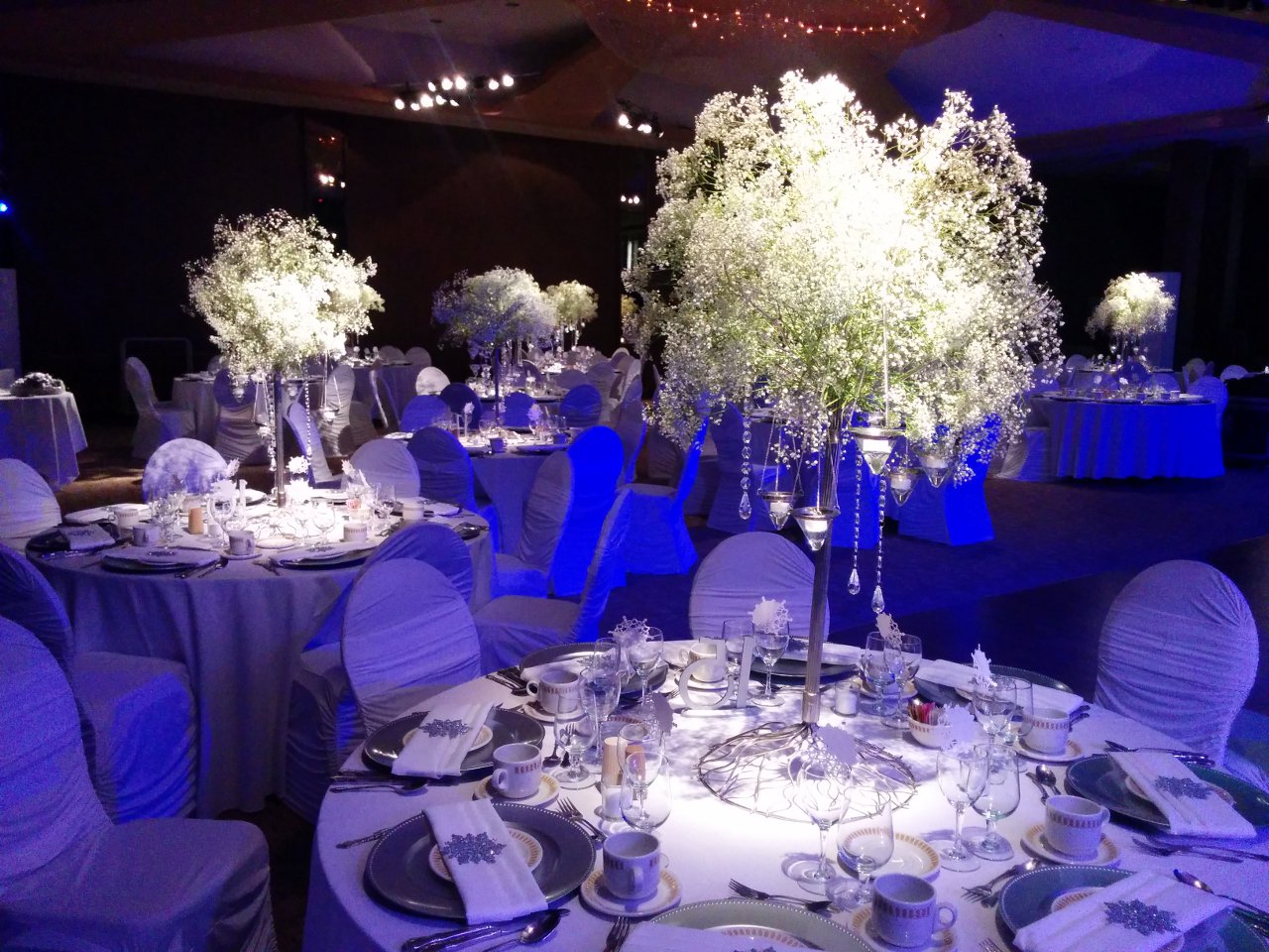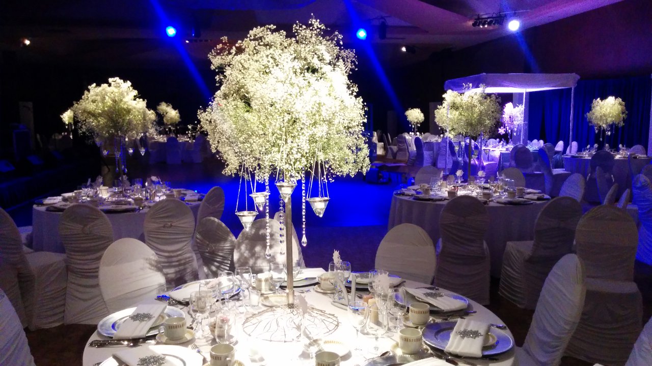 "Wow!" is the first thing you hear when walking into a room with pin spot lighting. The truth of the matter is pictures don't do it justice. You have to see it for yourself. Once you've seen it done right you'll never go back to standard house lighting again. You spend a small fortune on centre pieces just to have them either lost in the dark or washed away from dull, banquet room lighting. With pin spot lighting design is highlited, colors pop and guests are swept off their feet the moment they enter. A must for every evening function.