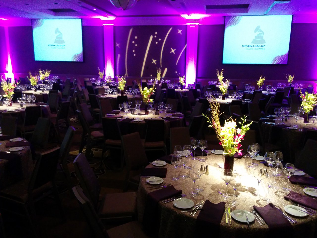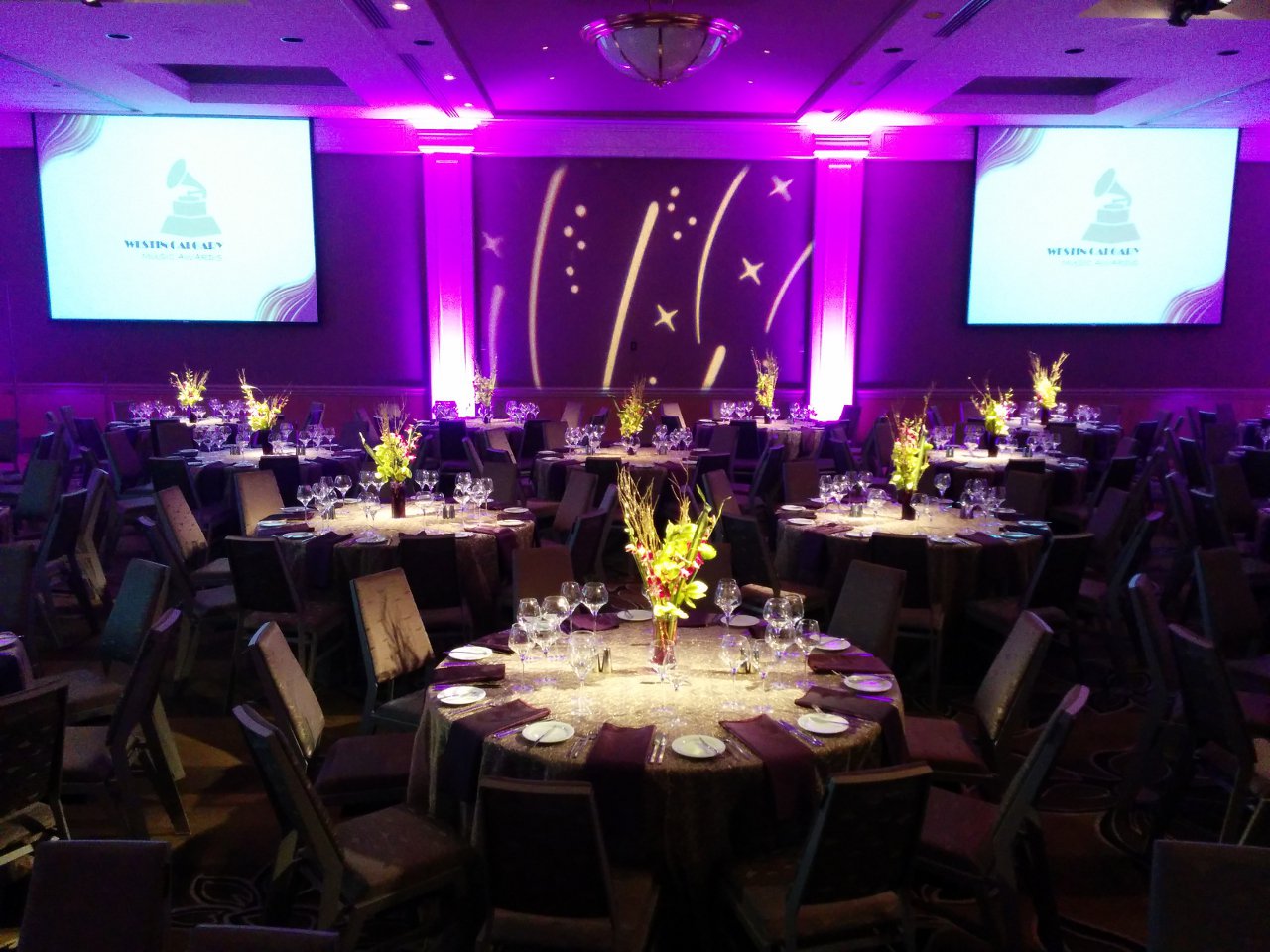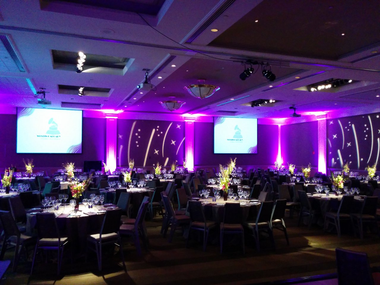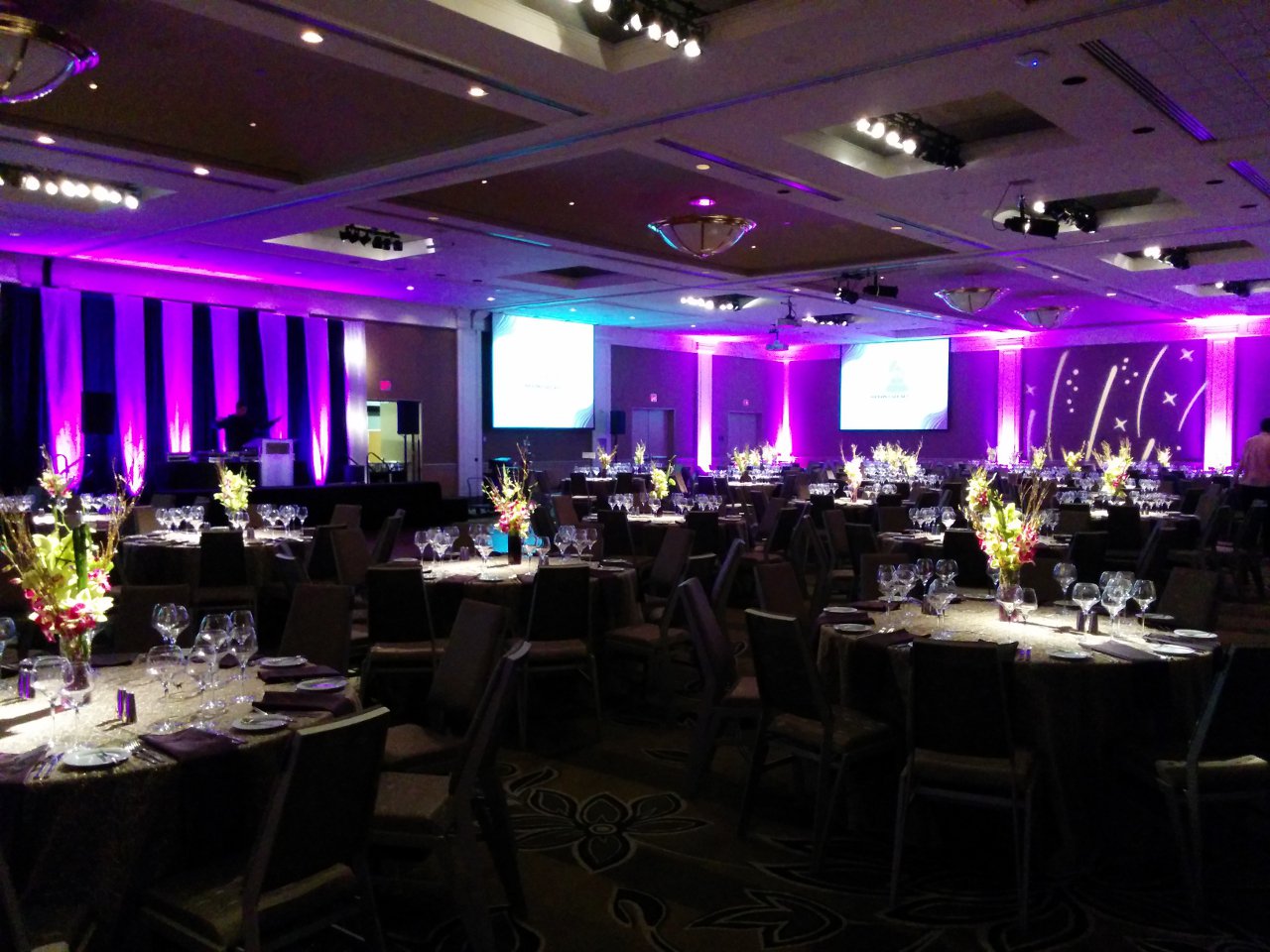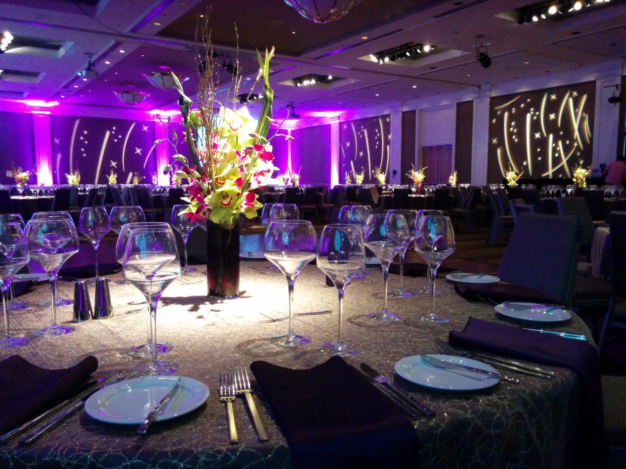 Brown carpets and brown walls. This is the setting of a standard ballroom. Dull and boring. With LED uplighting you can have any color you want. Purple and blue, red and amber, complete rainbow. The design capabilities are endless. Gobo splashing adds attention to detail. We can cover the walls with exciting designs or even your own custom logos. A great element for events of all budgets.