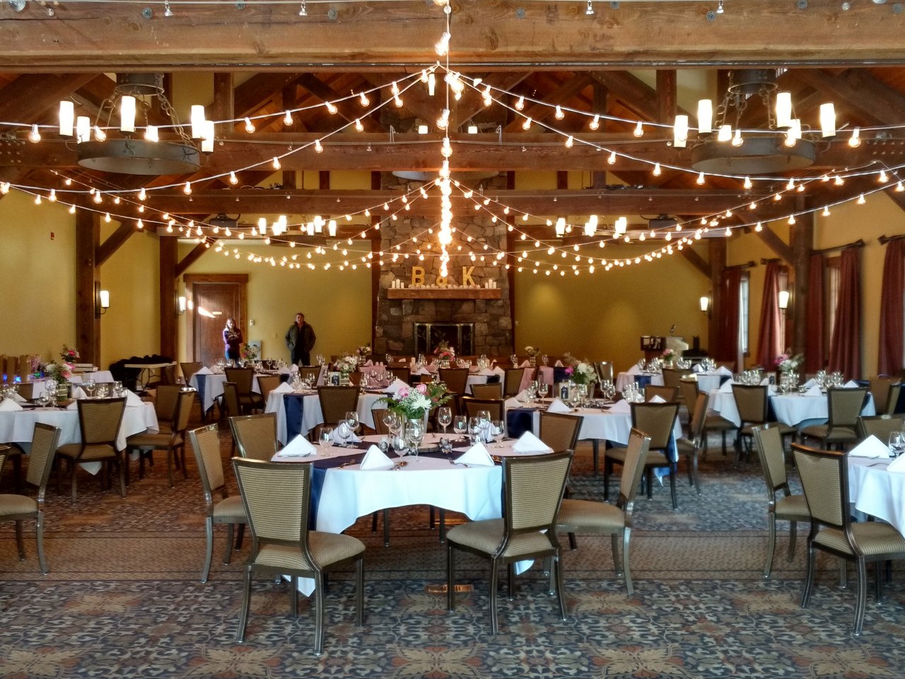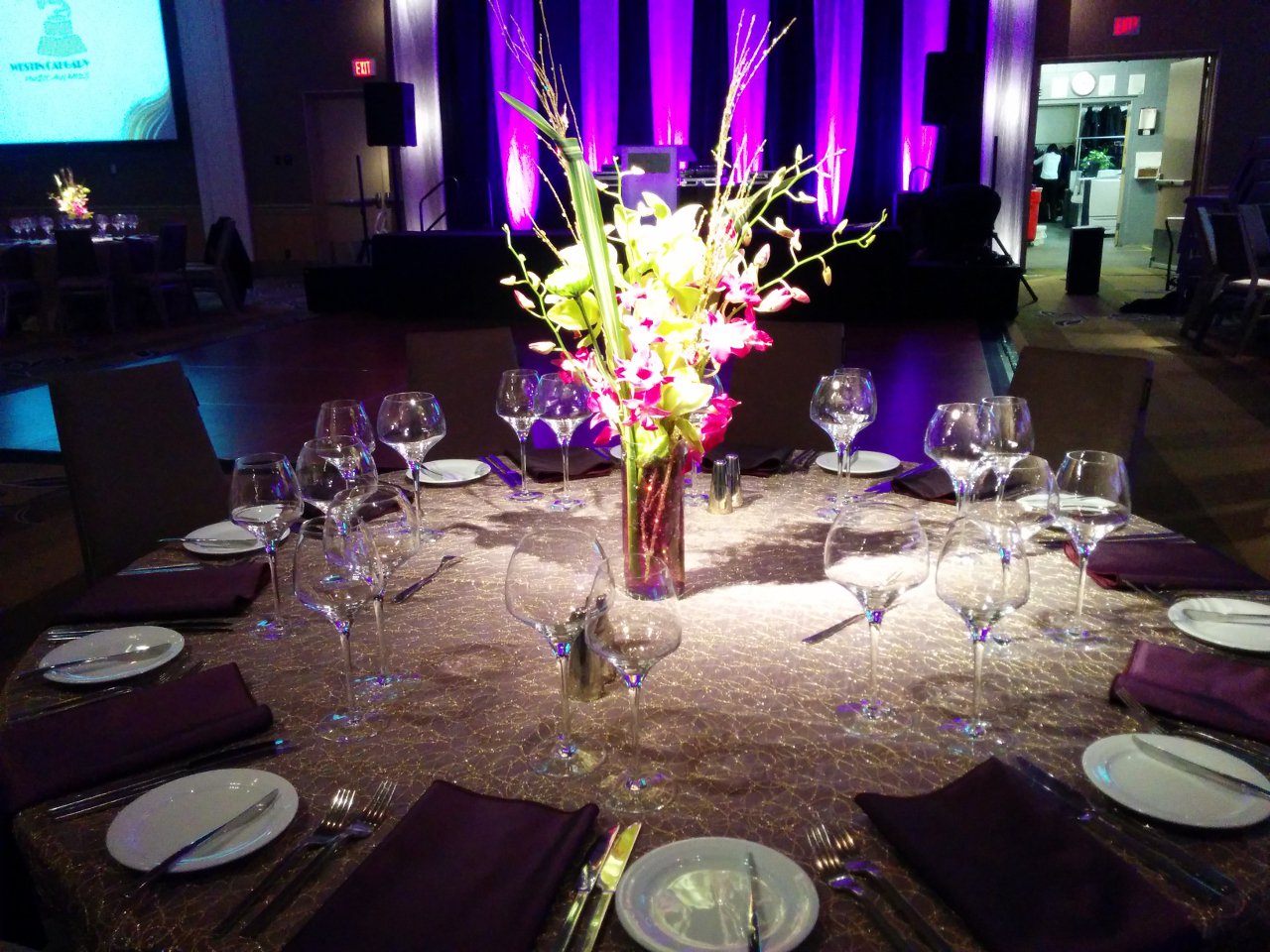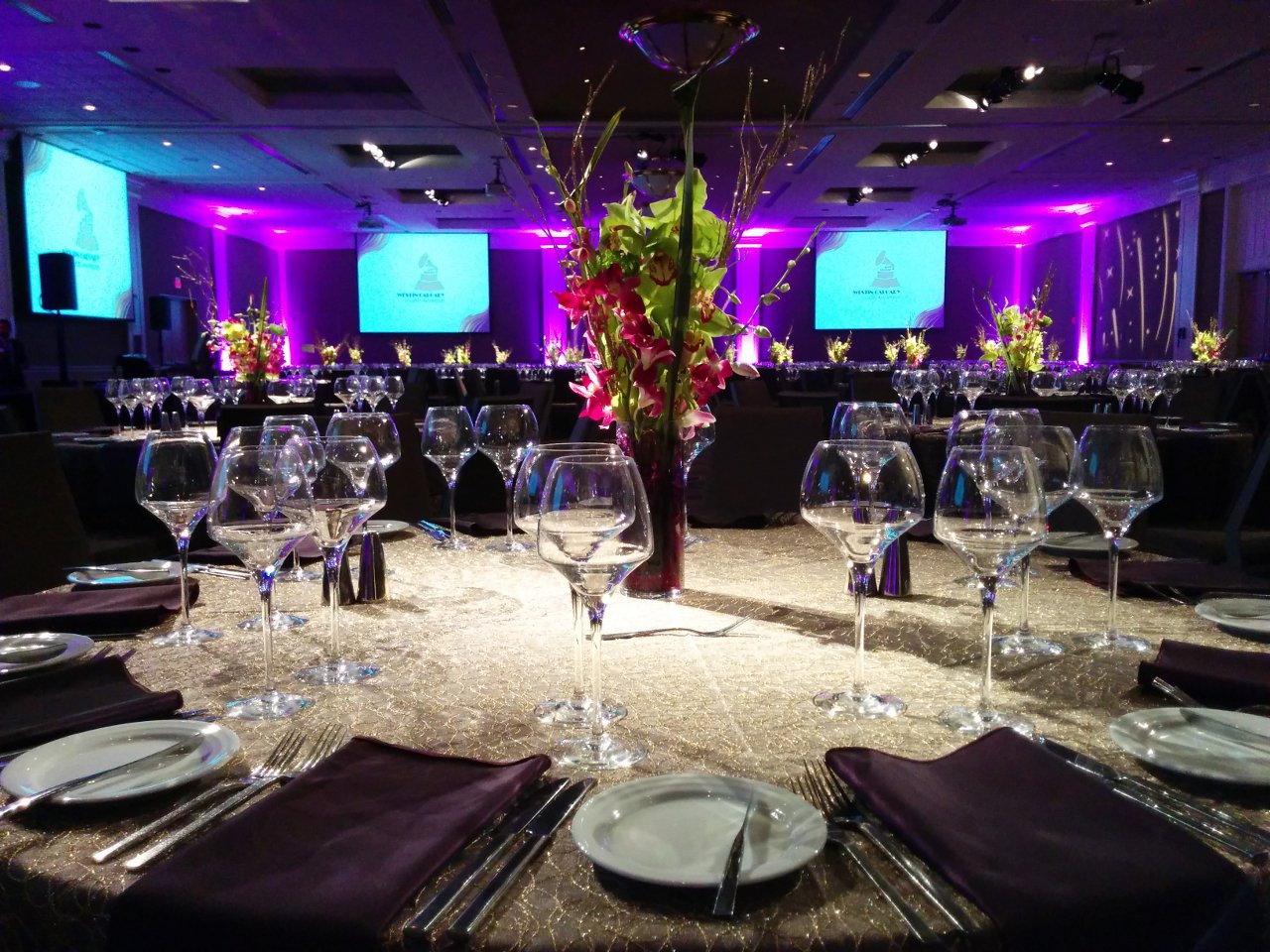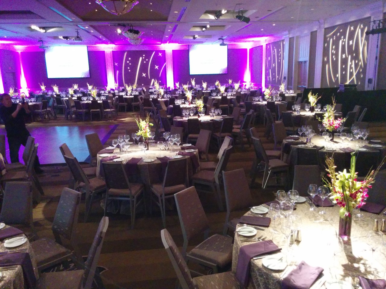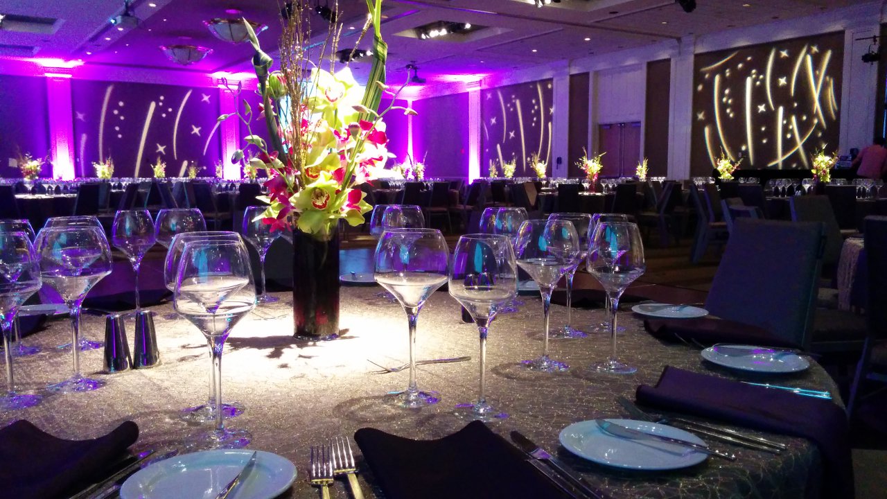 Brown carpets and brown walls. This is the setting of a standard ballroom. Dull and boring. With LED uplighting you can have any color you want. Purple and blue, red and amber, complete rainbow. The design capabilities are endless. Gobo splashing adds attention to detail. We can cover the walls with exciting designs or even your own custom logos. A great element for events of all budgets.