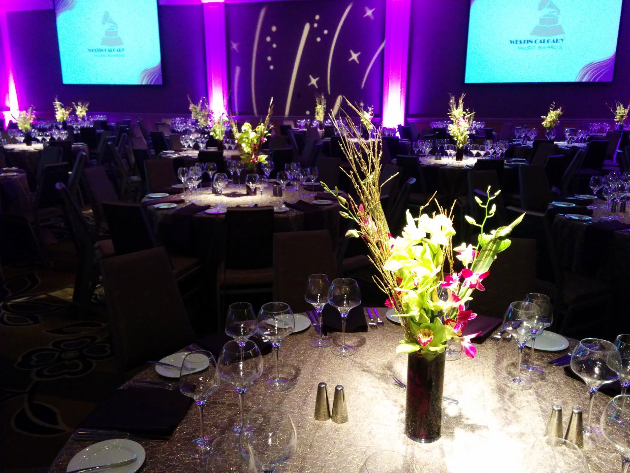 "Wow!" is the first thing you hear when walking into a room with pin spot lighting. The truth of the matter is pictures don't do it justice. You have to see it for yourself. Once you've seen it done right you'll never go back to standard house lighting again. You spend a small fortune on centre pieces just to have them either lost in the dark or washed away from dull, banquet room lighting. With pin spot lighting design is highlited, colors pop and guests are swept off their feet the moment they enter. A must for every evening function.